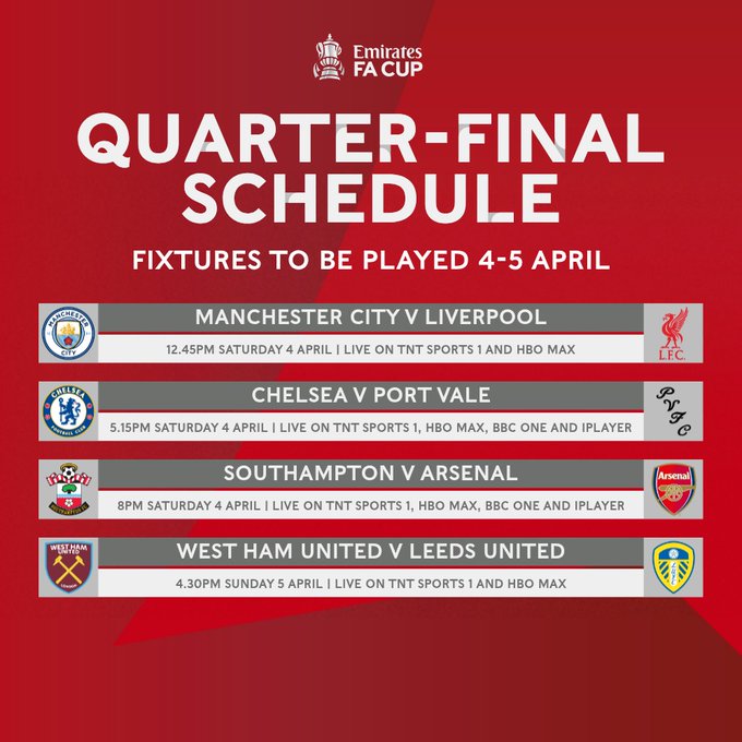 Të shtunen e 4 prillit zhvillohen edhe dy ndeshje tjera, ajo mes Chelseas dhe Port Vale, më fillim nga ora 18:15 dhe ajo mes Southamtonit dhe Arsenalit, nga ora 21:00.