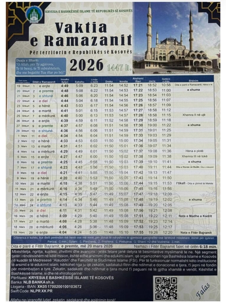 Vaktia e Ramazanit përfshin oraret e sakta të syfyrit, iftarit dhe namazeve dhe shërben si udhërrëfyes ditor për besimtarët në Kosovë gjatë gjithë muajit të agjërimit.