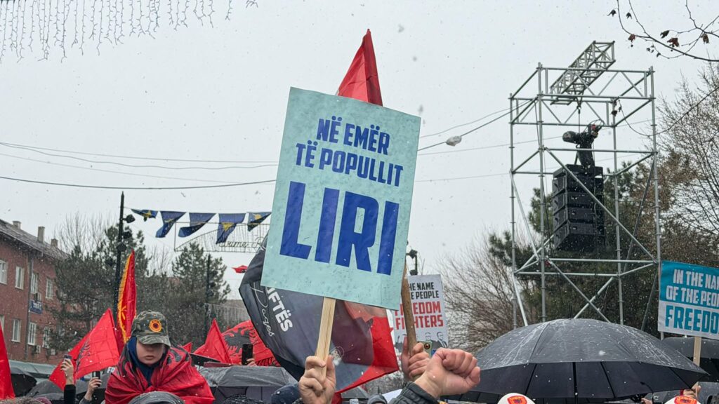 Në shesh është vendosur edhe një mbishkrim i madh me moton: “Drejtësi, jo politikë”, i shoqëruar me fotografitë e katër të akuzuarve, të cilët prej më shumë se pesë vitesh po përballen me proces gjyqësor në Dhomat e Specializuara në Hagë./Indeksonline./
