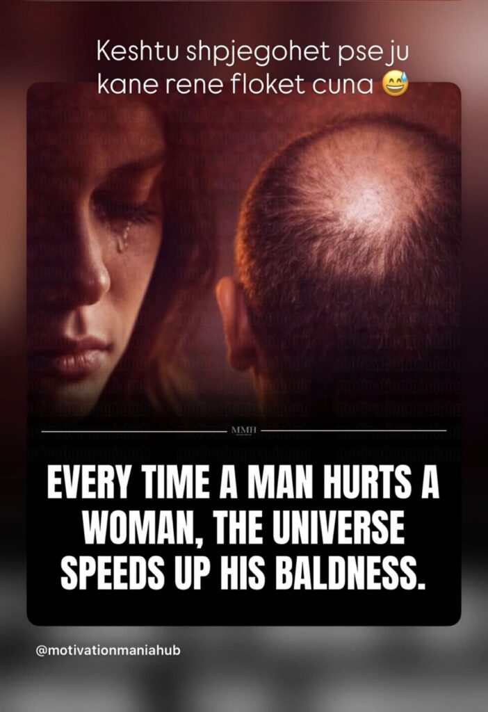 “Sa herë që një burrë e lëndon një grua, universi ia përshpejton rënien e flokëve”, thuhet në këtë postim.