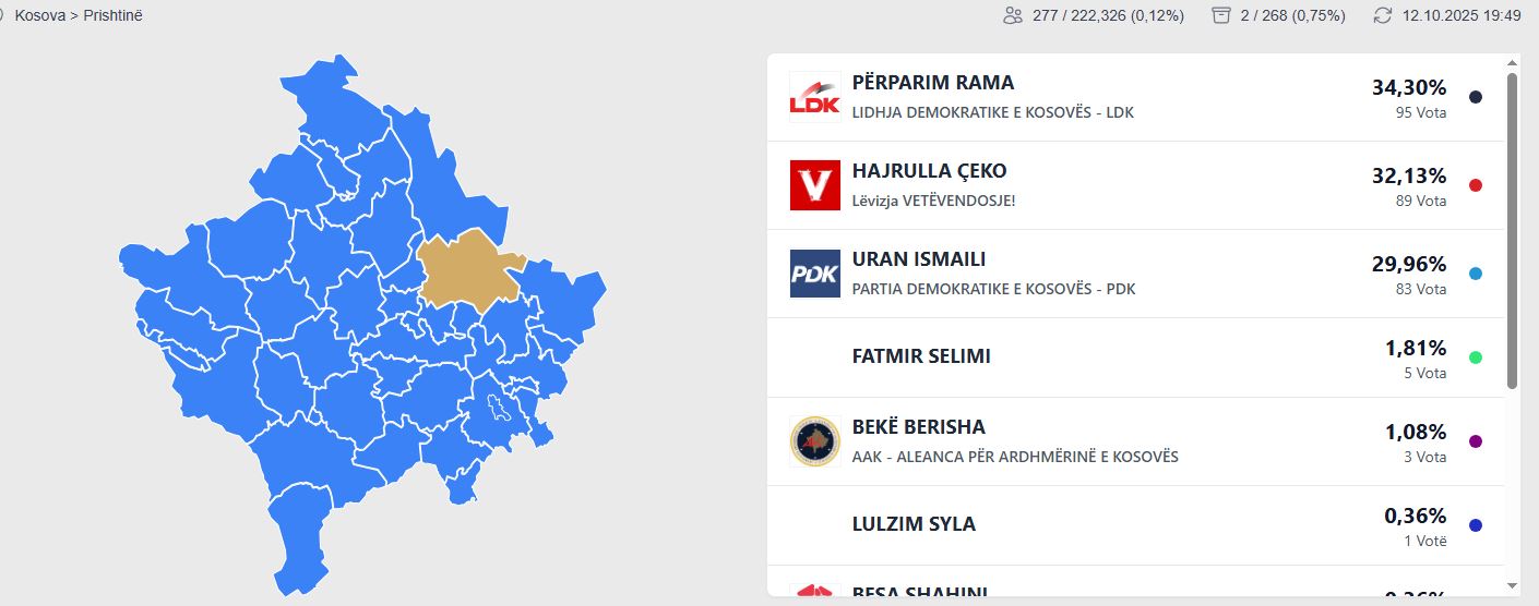 Sipas KQZ-së, Përparim Rama ka marrë 35,30 % të votavae, Hajrulla Çeku i LVV-së 32,13%, Fatmir Selimi 1,81%, transmeton IndeksOnline.