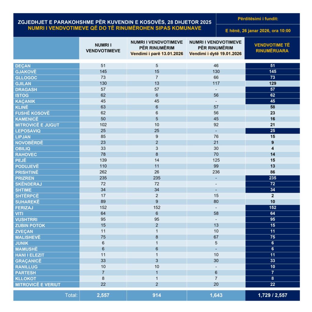 Nga fillimi i këtij procesi (e martë, 13 janar 2026, ora 18:00) dhe deri tani (e hënë, 26 janar 2026, ora 10:00) janë rinumëruar rreth 67% apo 1,729 nga 2,557 vendvotime.