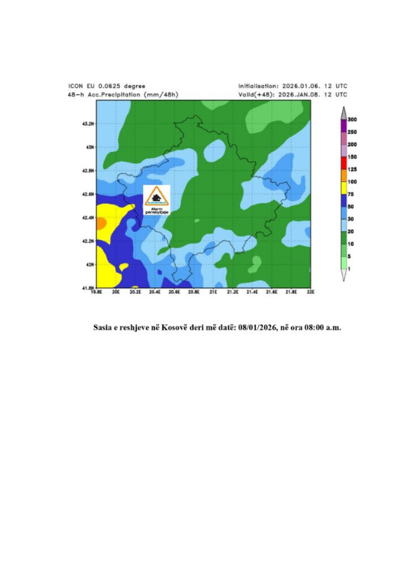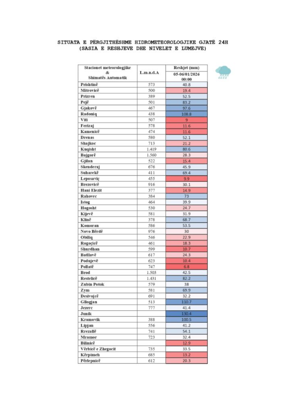 Instituti Hidrometeorologjik i Kosovës (IHMK) ka njoftuar se nga 05 deri më 06 janar të këtij viti, në territorin e Republikës së Kosovës ka pasur të reshura mesatarisht 43mm l/m2.