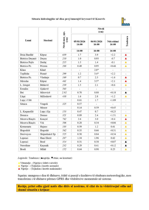 IHMK thotë se lumenjtë në lindje dhe jug të vendit si: Ibri, Sitnica, Morava e Binçës, Lepenci, Nerodimja, aktualisht kanë ngritje të lehtë të niveleve dhe nuk paraqesin probleme.