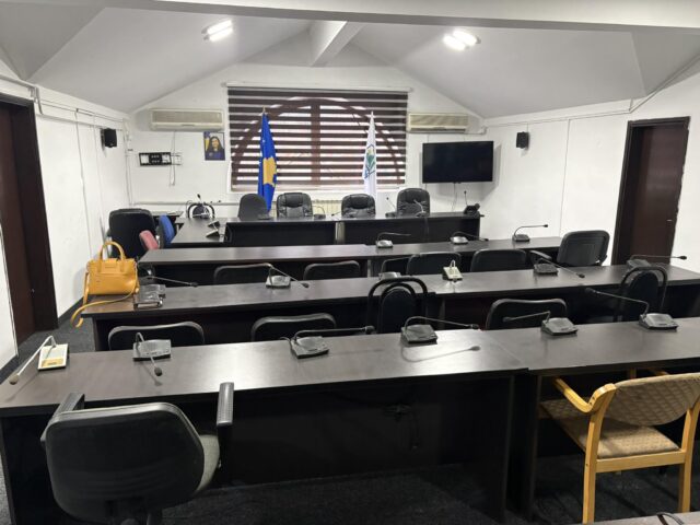 Simbolet dhe flamuri i Kosovës në Kuvendin komunal të Mitrovicës Veriore ku do të bëhet betimi i kryetarit të ri