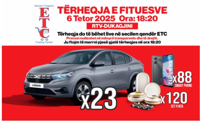 Qendra Tregtare ETC njofton se më 6 Tetor 2025, ora 18:20, do të zhvillohet tërheqja e madhe e fituesve të lojës shpërblyese. Ngjarja do të transmetohet drejtpërdrejt në RTV Dukagjini dhe në secilën pikë të ETC, duke garantuar një proces transparent dhe të drejtë.
