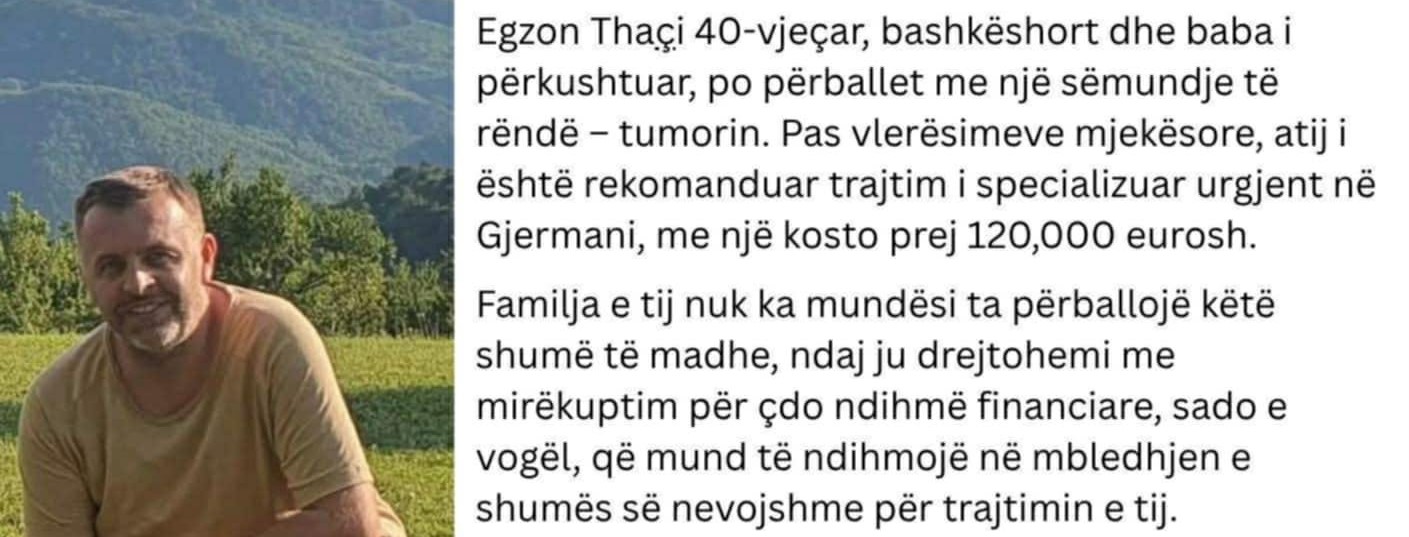 “Familja jonë nuk ka mundësi ta përballojë këtë shumë të madhe. Ju drejtohemi me mirëkuptim për çdo ndihmë financiare, sado e vogël, që mund të ndihmojë në mbledhjen e shumës së nevojshme për trajtimin e tij. Çdo kontribut dhe çdo shpërndarje e kësaj thirrjeje është një hap më afër shërimit të tij,” thuhet në apelin e familjes.