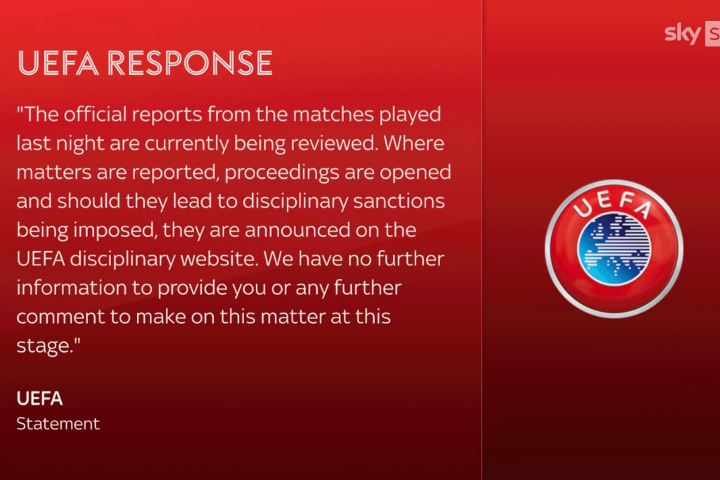 “Raportet zyrtare nga ndeshjet e zhvilluara mbrëmë janë aktualisht duke u shqyrtuar. Kur raportohen çështje, hapen procedura dhe, nëse ato çojnë në vendosjen e sanksioneve disiplinore, ato shpallen në faqen disiplinore të UEFA-s. Nuk kemi informacion tjetër për t’ju ofruar apo ndonjë koment shtesë për të bërë mbi këtë çështje në këtë fazë.”