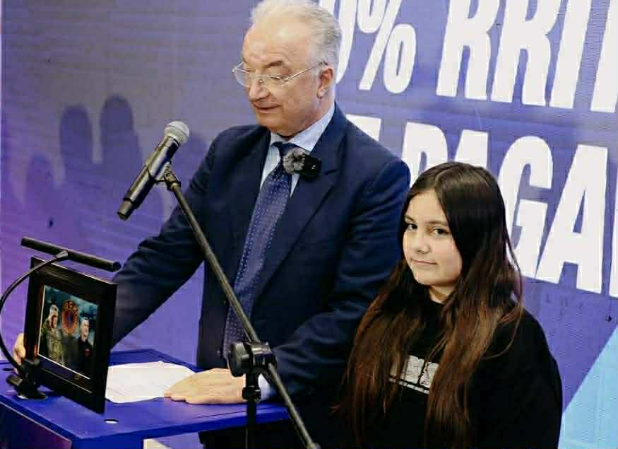 Vajza e ish-ushtarit të UÇK-së, ia dhuron Xhavit Halitit fotografinë me Thaçin e Veselin