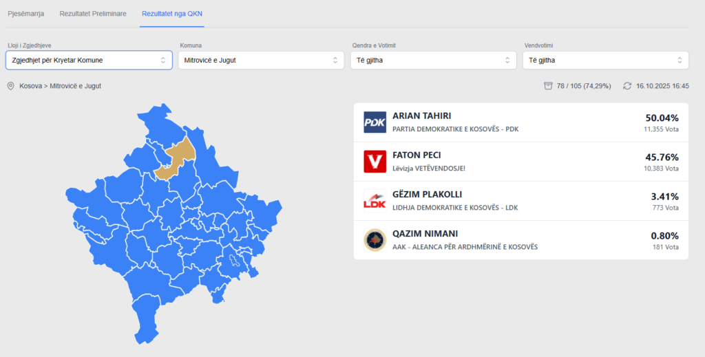 Nga 74.29% të vendvotimeve të procesuara në garën për kryetar të Komunës së Mitrovicës, Arian Tahiri i Partisë Demokratike të Kosovës (PDK) prin me 50.04 për qind të votave të fituara.