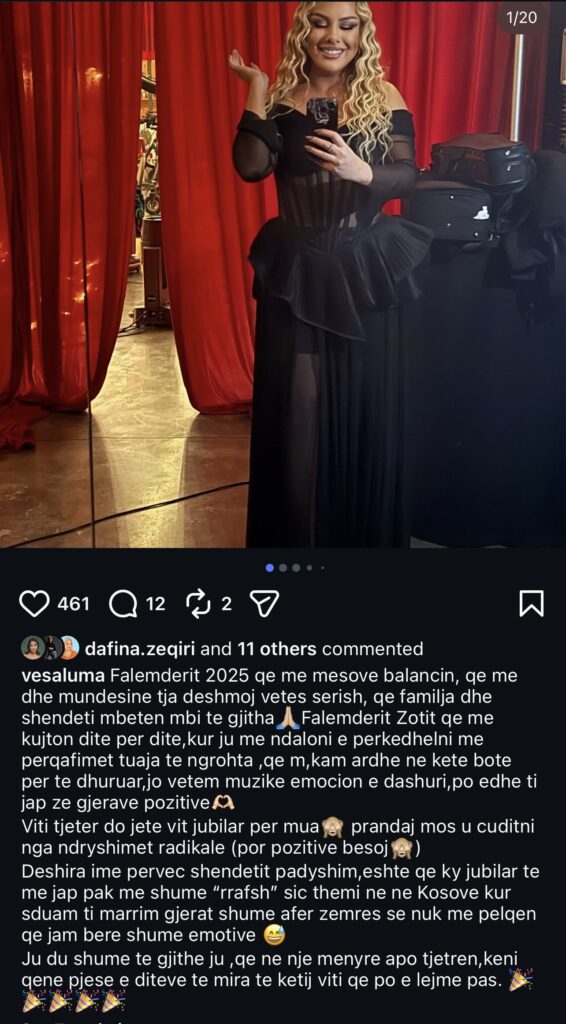 “Faleminderit 2025 që më mësove balancën, që më dhe mundësinë ta dëshmoj veten sërish,” shkruan këngëtarja, duke shtuar se muzika për të nuk është vetëm art, por edhe emocion, dashuri dhe dhurim i energjive pozitive për publikun.