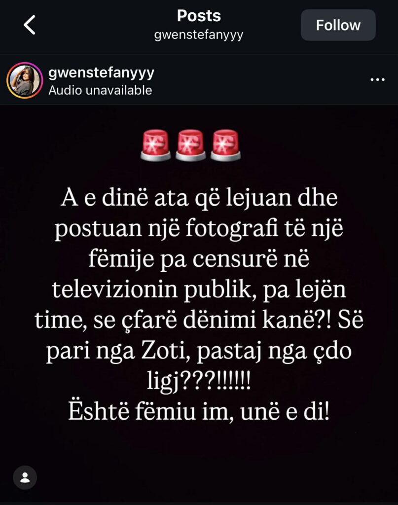 “A e dinë ata që lejuan dhe postuan një fotografi pa censurë në televizionin publik, pa lejen time, se çfarë dënimi kanë?! Së pari nga Zoti, pastaj nga ligji. Është fëmija im, unë e di”, ka shkruar ajo.