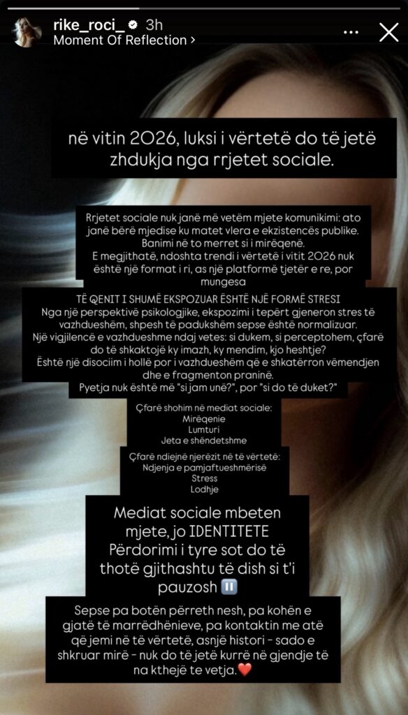 Sipas saj, në vitin 2026 luksi i vërtetë nuk do të lidhet me famën apo dukjen në rrjete sociale, por me mungesën nga to. Roçi thekson se rrjetet sociale janë kthyer në mjete që matin vlerën e ekzistencës publike, duke gjeneruar stres, lodhje dhe ndjenjë pamjaftueshmërie te njerëzit.